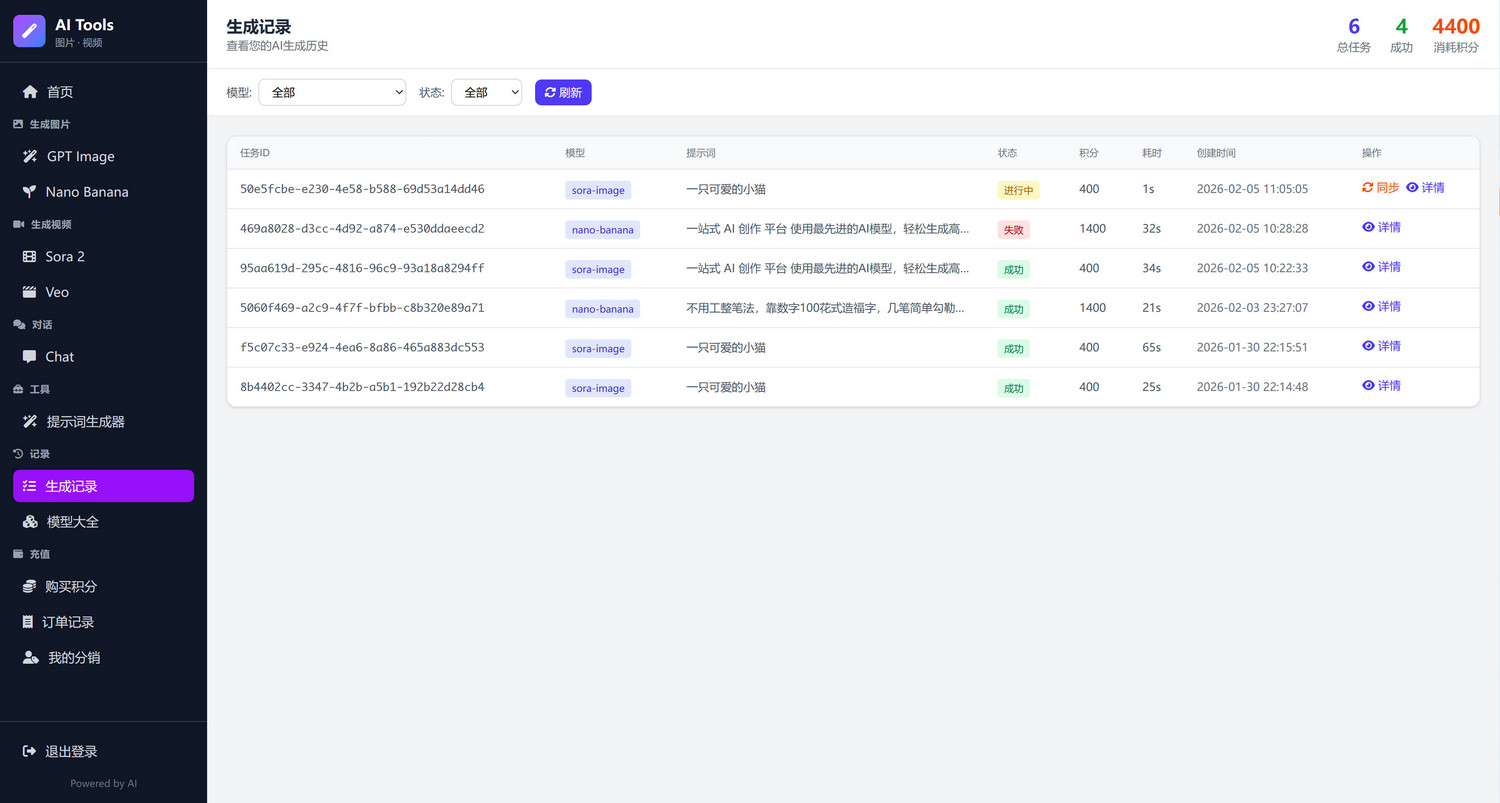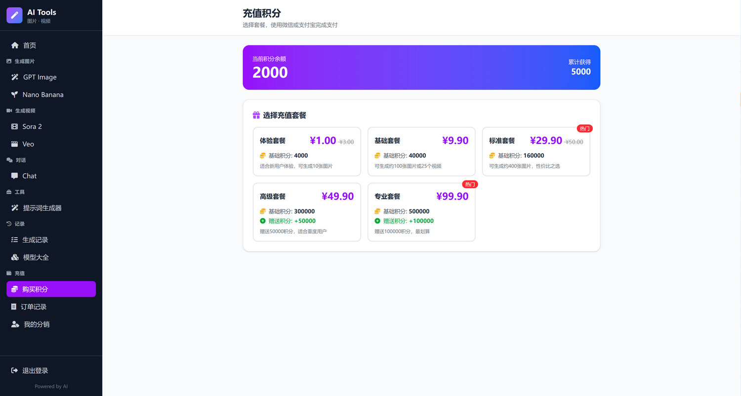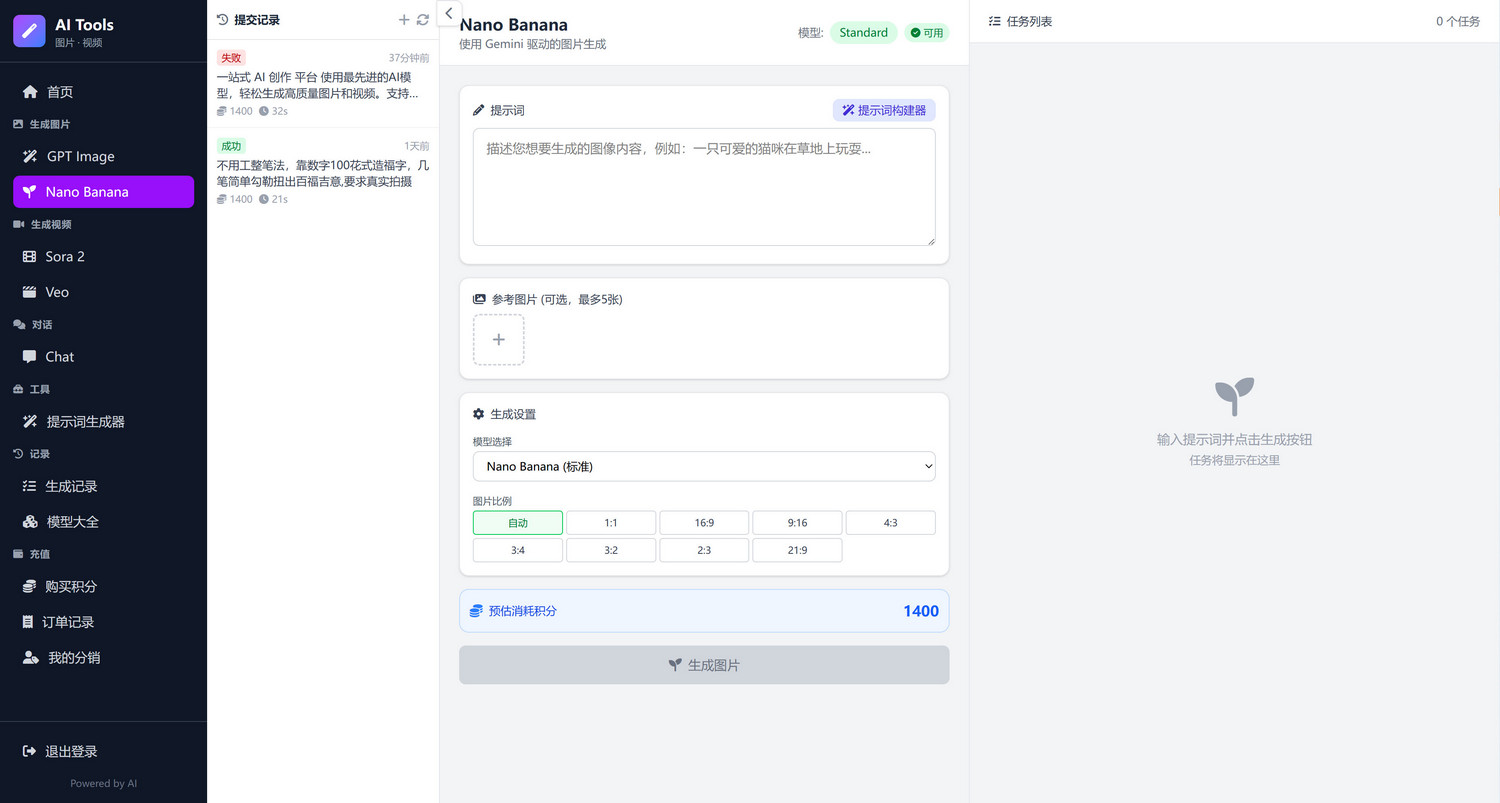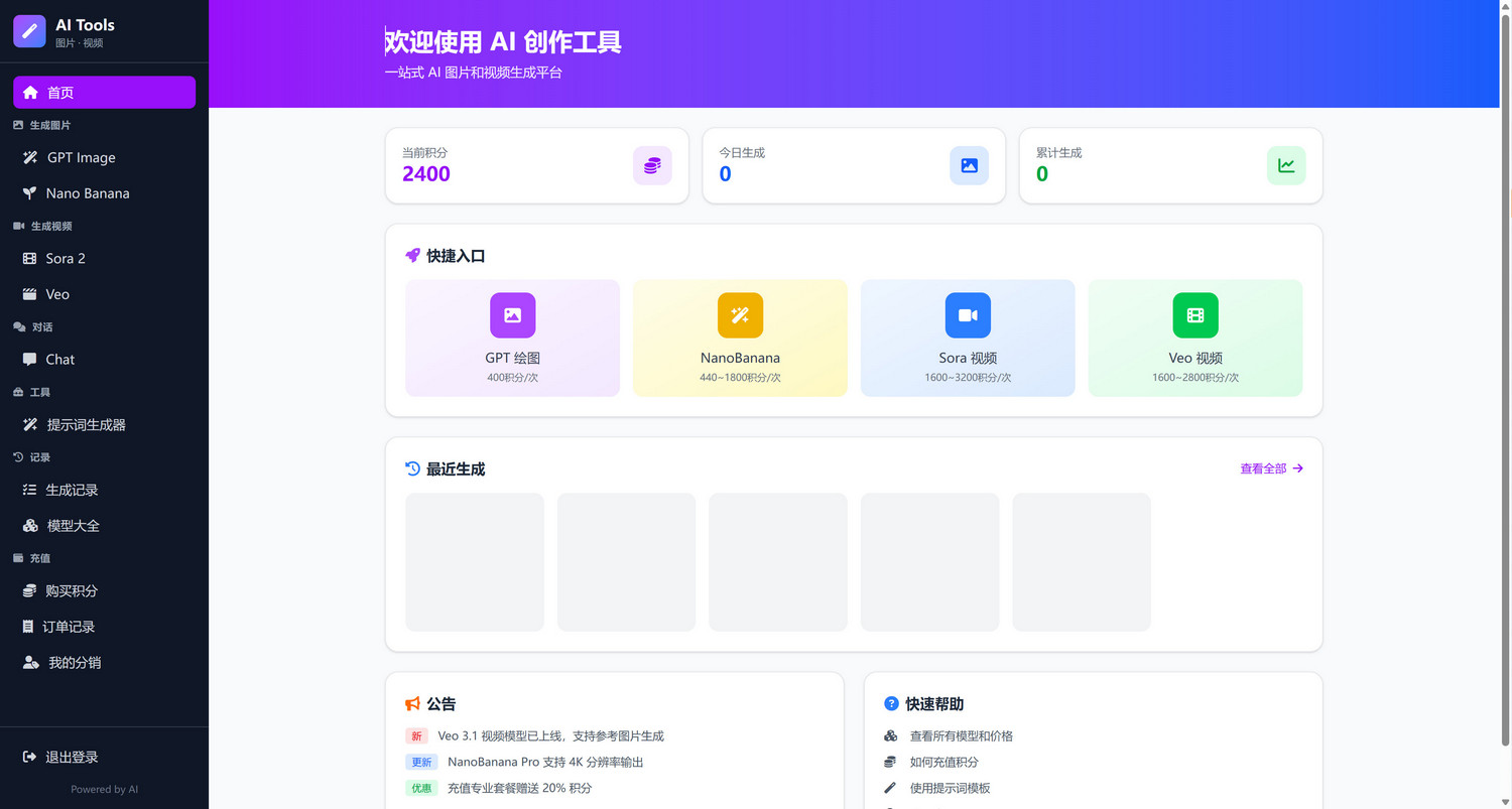 一站式 AI 创作 平台 使用最先进的AI模型,轻松生成高质量图片和视频。支持GPT绘图、NanoBanana、Sora视频、Veo视频等多种创作工具。