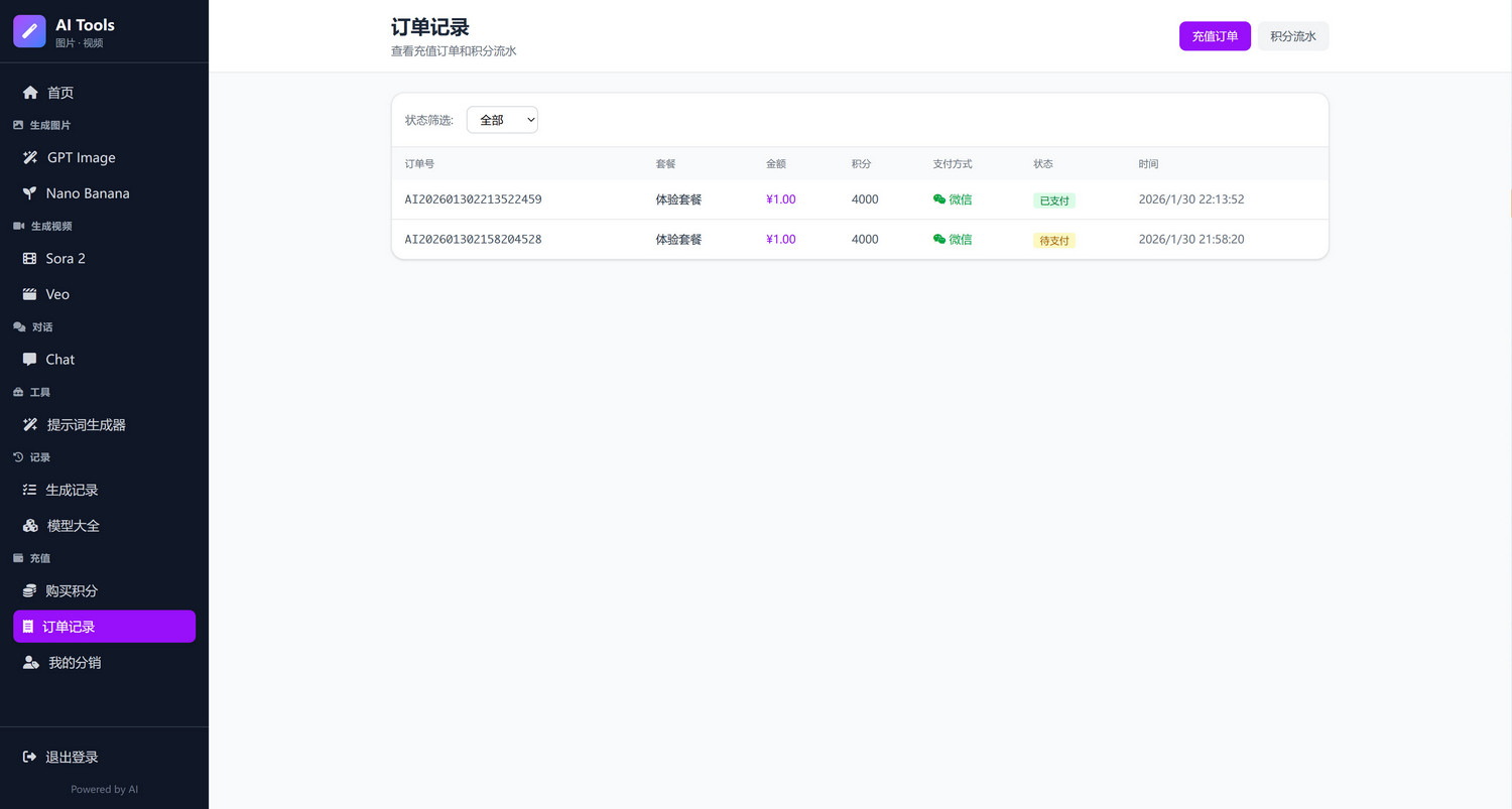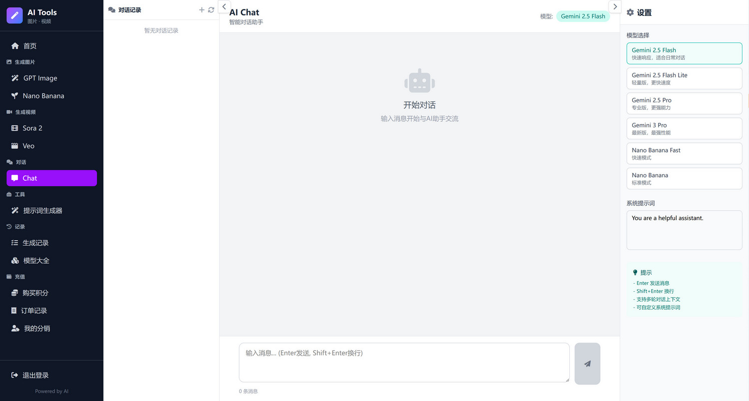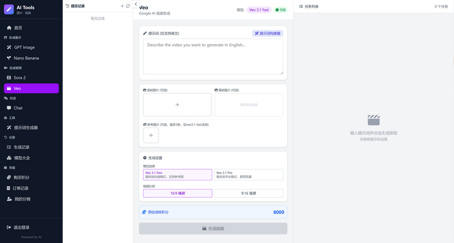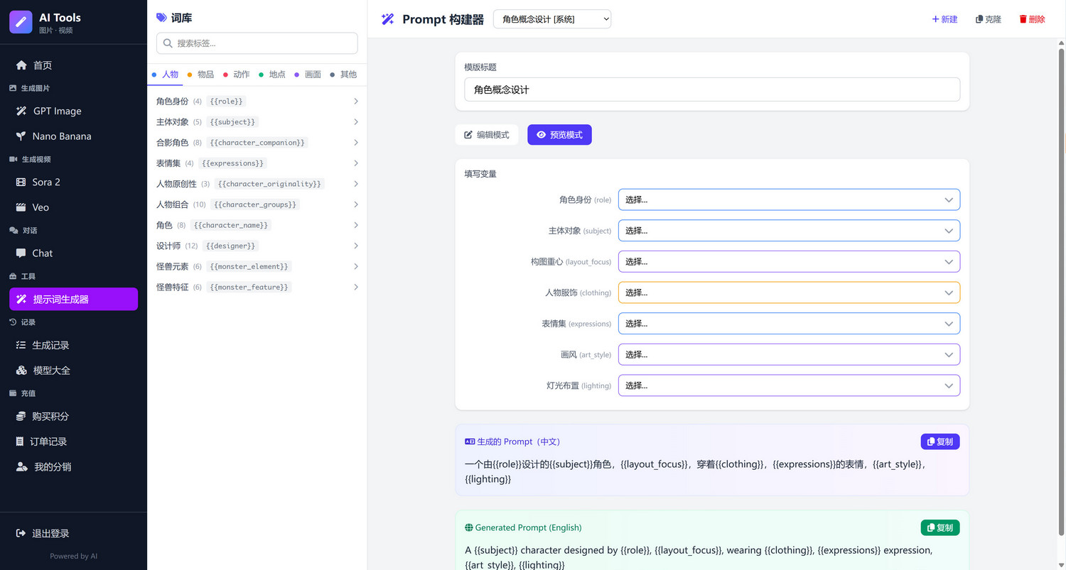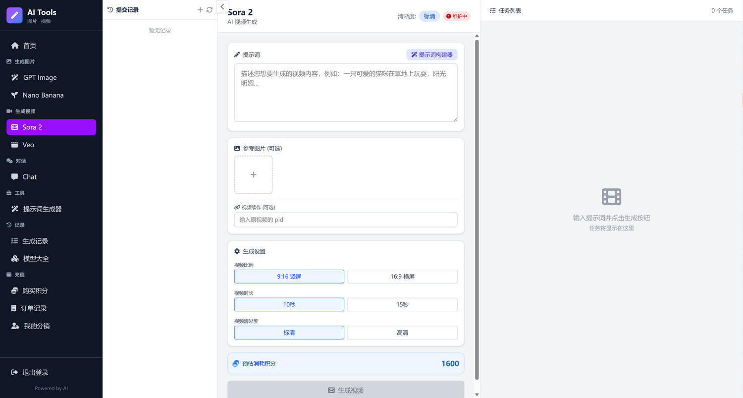 一站式 AI 创作 平台 使用最先进的AI模型,轻松生成高质量图片和视频。支持GPT绘图、NanoBanana、Sora视频、Veo视频等多种创作工具。